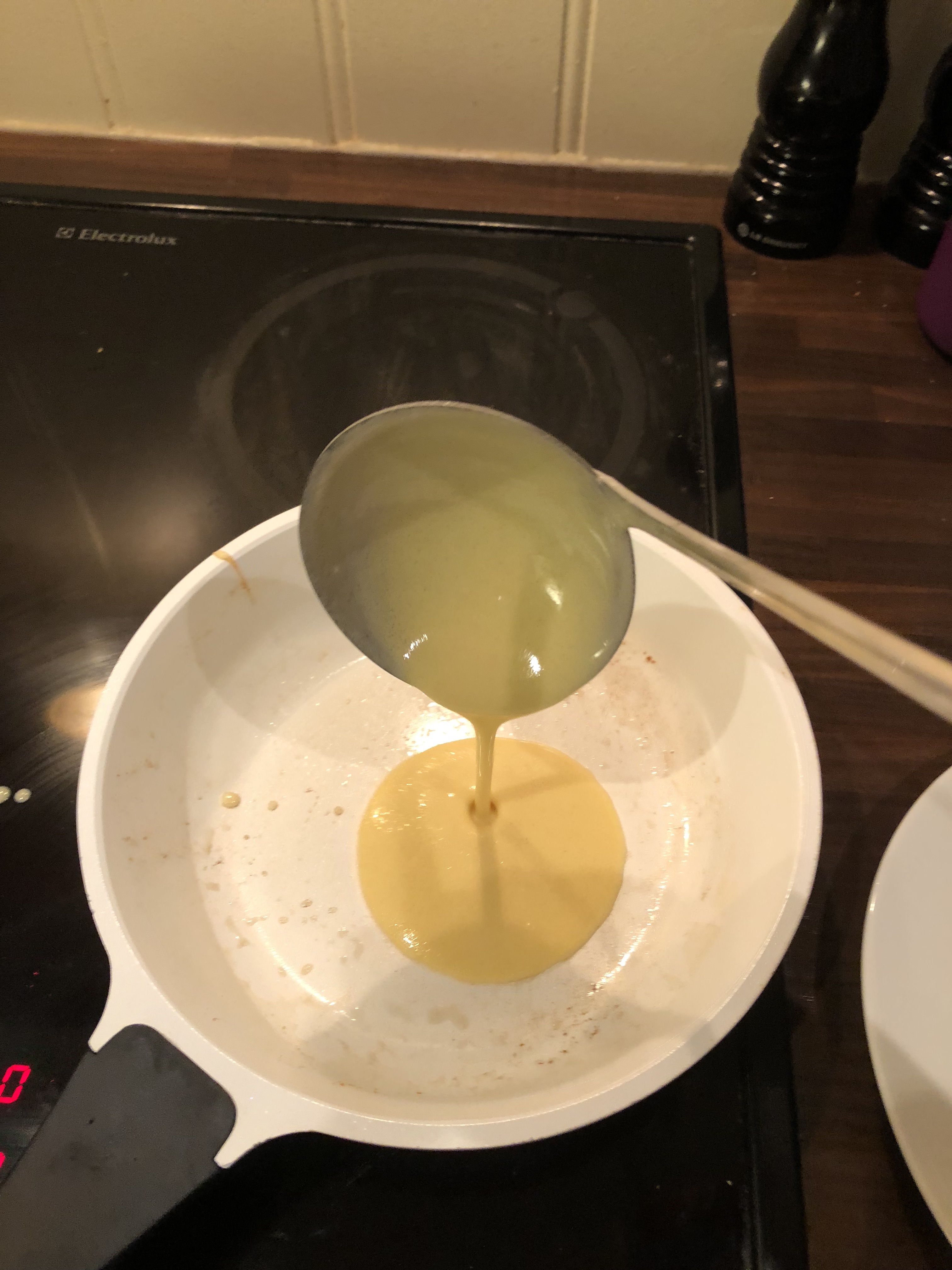 Pour the pancake batter in the middle (3/4 of scoop)