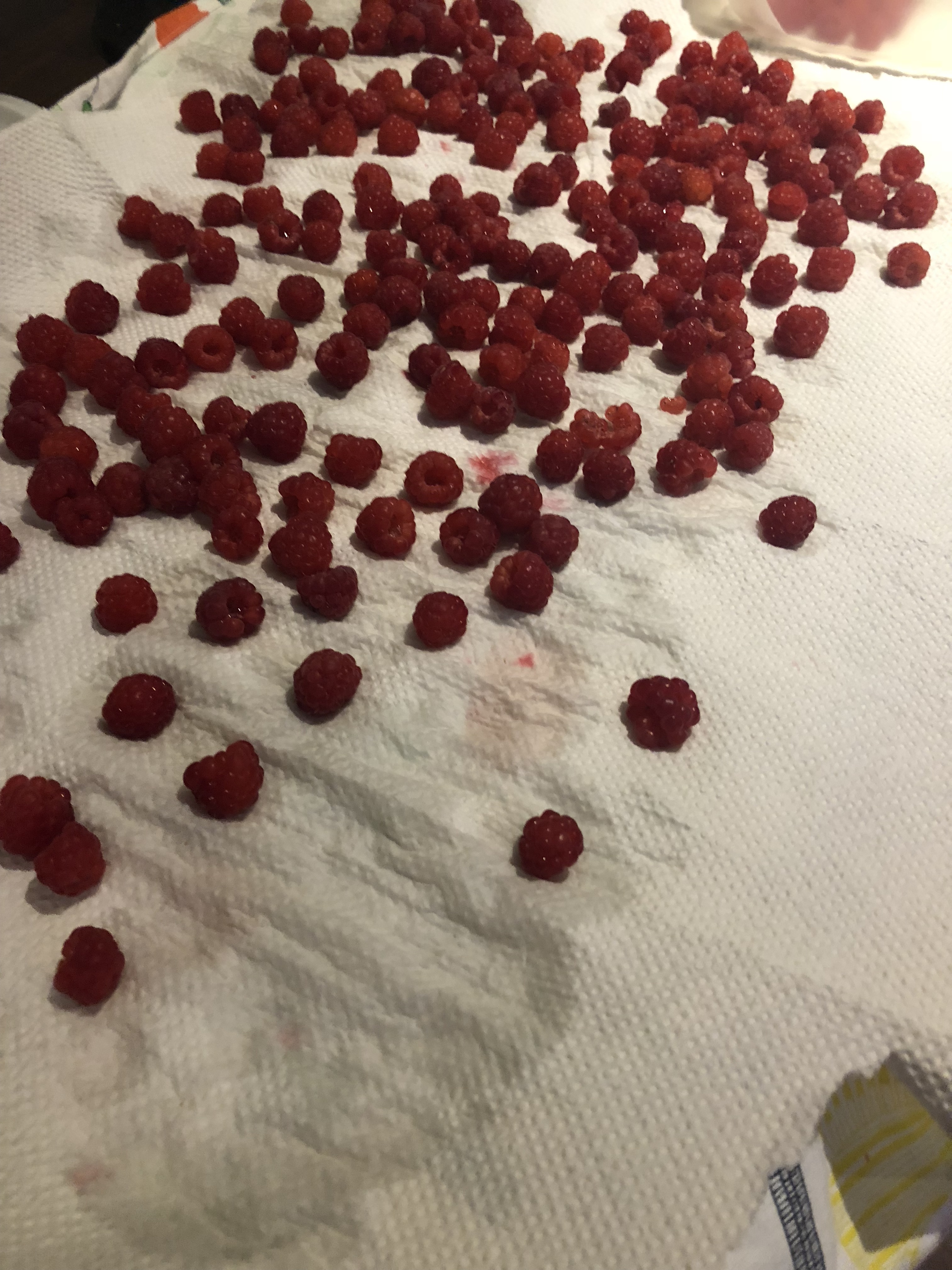 Washed raspberries drying on a paper towels